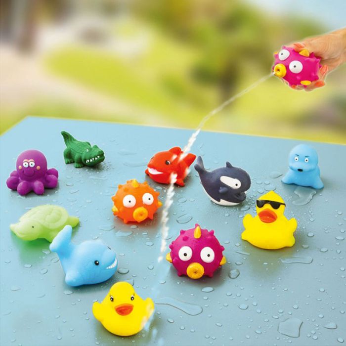 Die Tiere in das Wasser halten und vollsaugen lassen. Anschliessend zusammenquetschen und los geht der Spass in der Badewanne oder im Garten. Aus Kunststoff. Masse: ca. L8-9 cm – je nach Motiv.