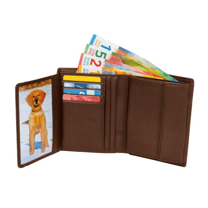 - 2 Notenfächer, 1 unterteiltes Münzfach mit Schlüsseleinstecklasche, 1 Fotofach