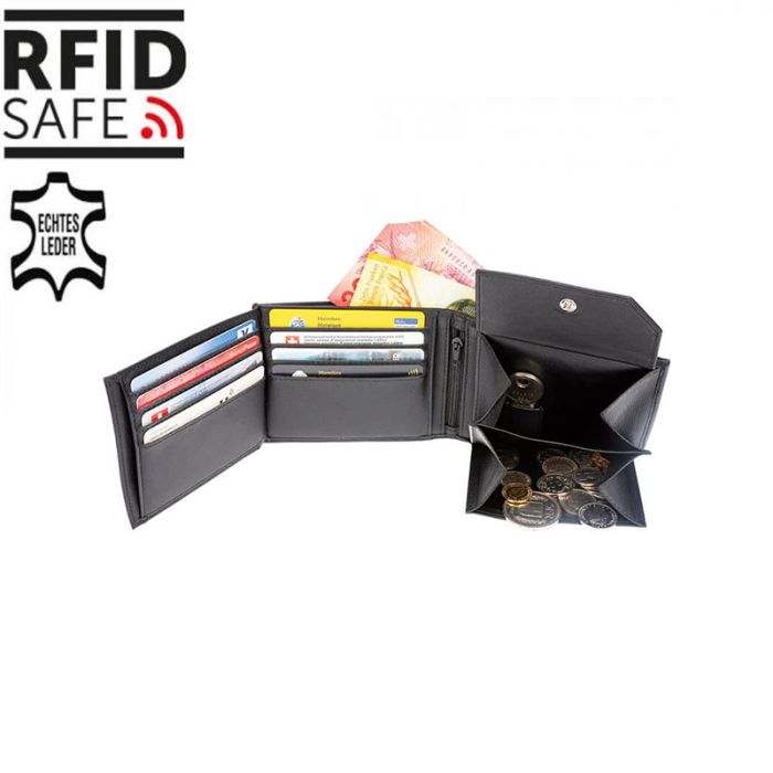 - 1 Sichtfach, 2 Notenfächer, 2 Münzfächer, 4 versteckte Fächer, eines mit Reissverschluss